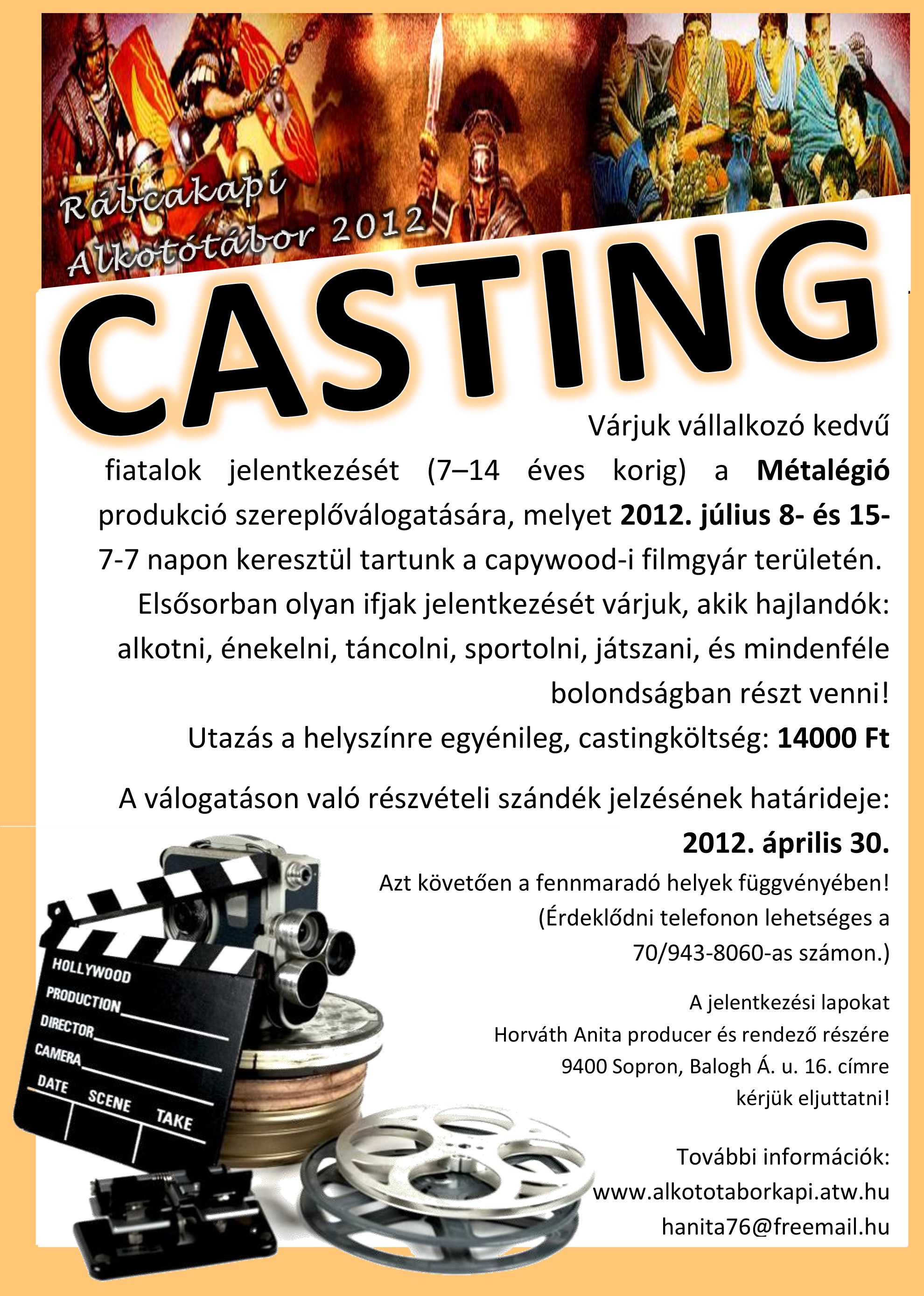 "Kedves Anita!Nem láttam a bemutatkozásban, hogy emlÃtetted volna a tábor legőrültebb tagját, aki Horváth Anita névre hallgat és a szabadidejének nagy részét a tábor tervezése tölti ki. Ezért érzem már márciusban azt,hogy sosem jön el a július. És ha meg eljön csak azt veszem észre,hogy elment,Köszönöm Neked(Nektek) a sok munkát és remélem mihamarabb találkozunk Kapin:-)"
